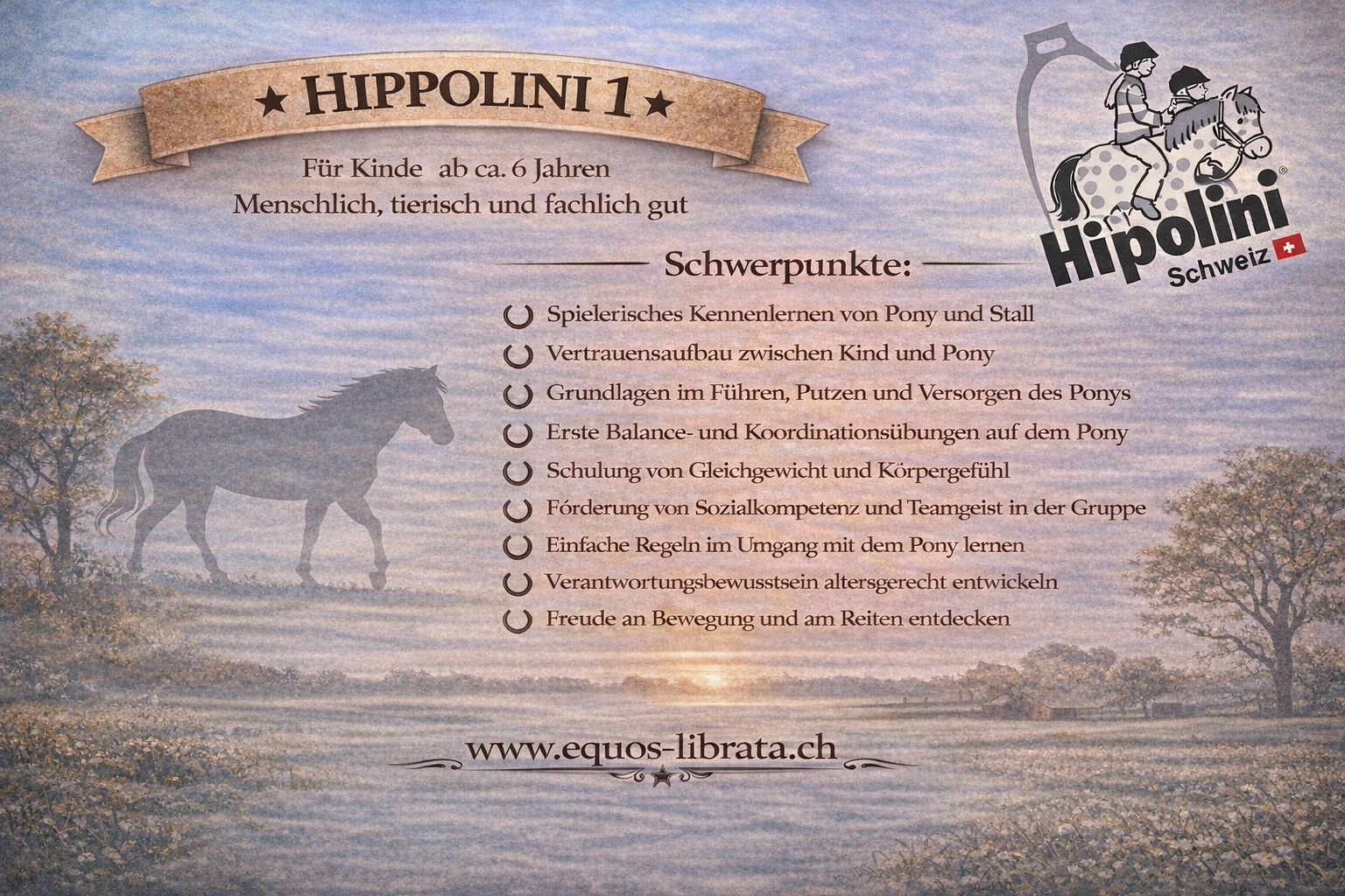 Angebot: Der Kurs wird als Ganzes Gebucht, Hippolini 1 A und Hippolini 1 B und beinhaltet je 10 Lektionen. In den Schulferien findet kein HIPPOLINI statt.